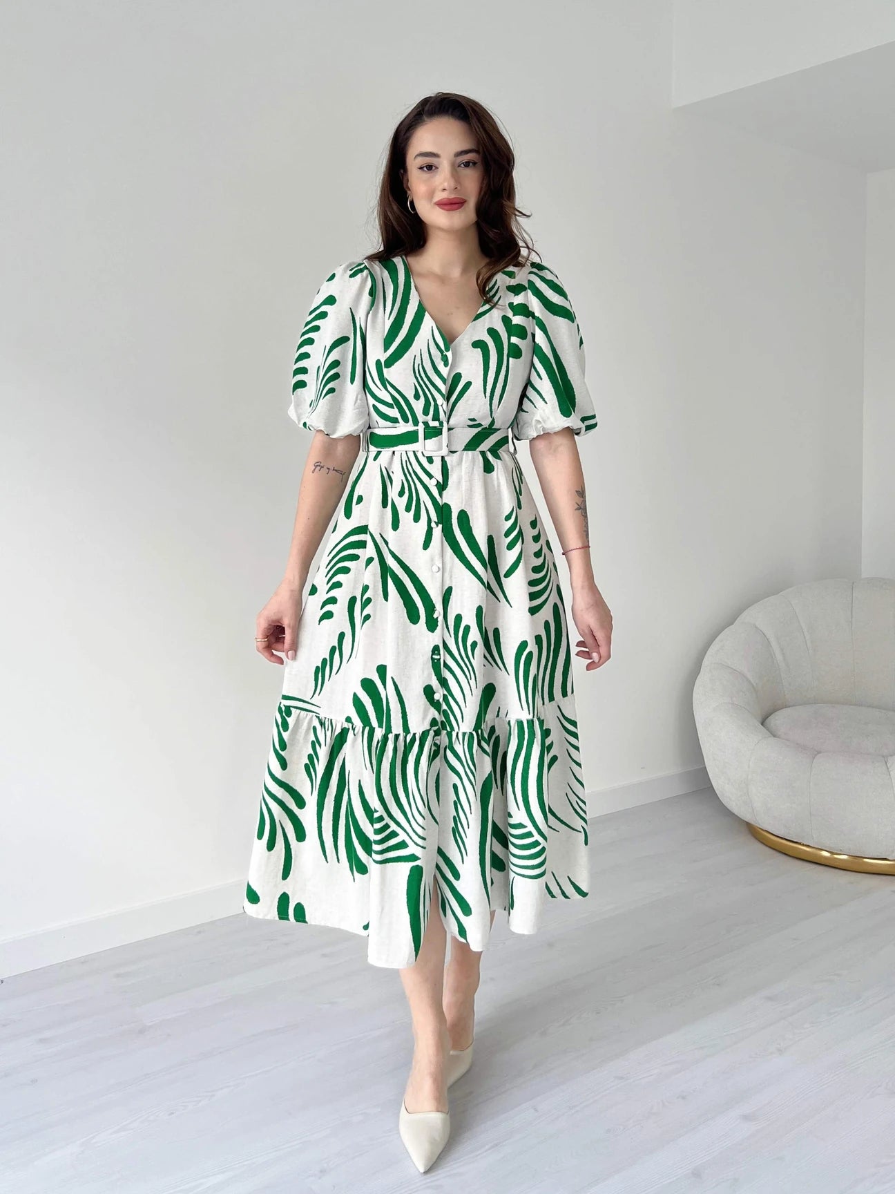 Stay cool and stylish in the Zarli Linen Dress. Made from pure linen, it feels light and breathable. The leafy print, puff sleeves, tiered hem, and matching belt give it a fresh, easy look.